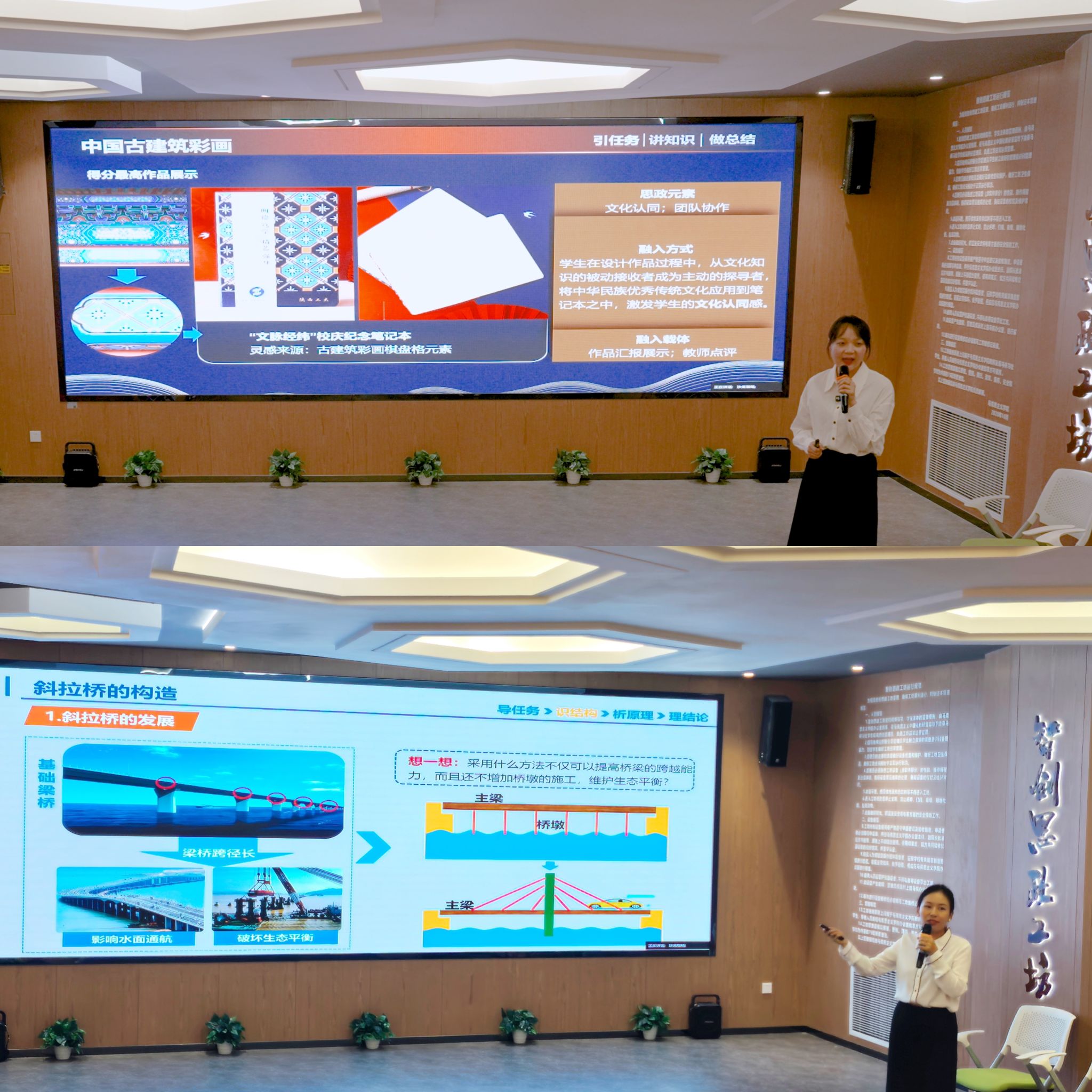 在“教师说”环节,井妍、柳雪丽两位教师分别以《室内设计史》、《道路桥梁工程》课程为例,分享了课程思政实施过程中的做法和经验。井妍老师以古建筑彩画艺术为载体,设置校庆文创产品设计和点评的教学环节,引导学生成为爱校荣校、传统文化的守护者;柳雪丽老师则通过港珠澳大桥案例,将大国担当和文化自信自然融入教学,实现了专业知识与育人内容的有机统一。