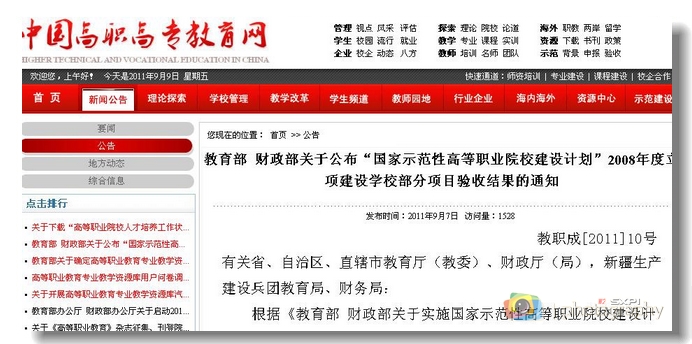 9月7日,国家教育部、财政部颁发了《关于公布“国家示范性高等职业院校建设计划”2008年度立项建设学校部分项目验收结果的通知》(教职成[2011]10号),公布了对2008年度立项建设的国家示范性高等职业学校项目建设验收评审结果,华体会平台“国家示范性高等职业院校建设计划”项目通过教育部、财政部验收。