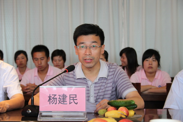 王天哲副书记致欢迎辞,他对常熟市东方染整厂在我院设立奖学金表示感谢,并介绍了我院的发展历史、人才培养、专业建设等。
