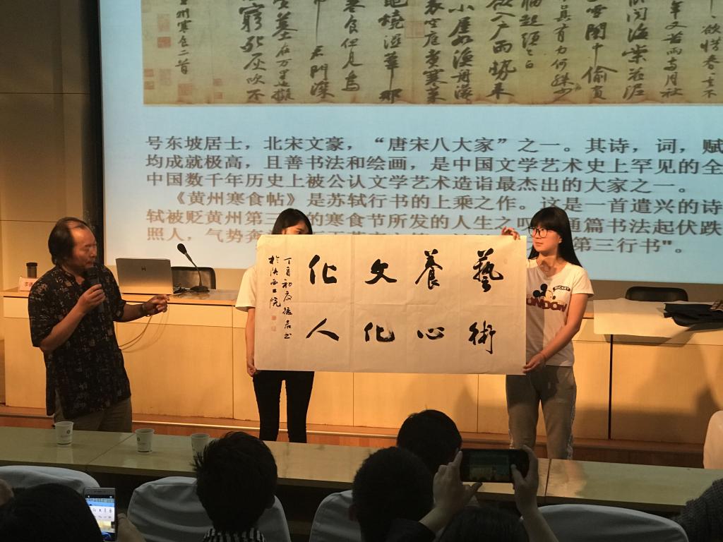 李德君教授从书法艺术的重要性讲起,就什么是中国书法、书法艺术的内涵、中国书法的主要书体、及书法艺术的技法知识做了精彩的讲解。通过对书圣王羲之的《兰亭序》、颜真卿的《祭侄文稿》和北宋大家苏轼书法作品的欣赏,对书法的审美标准和欣赏方法进行了深入细致的阐述。在接下来的学生互动环节,李教授对我院书法爱好者现场书写的“清风明月”,就字体结构、谋篇布局、题款用印等方面进行了指导,李教授还在现场为同学们书写了“艺术养心文化化人”以此勉励大家努力学习中华优秀传统文化,完善人格修养。