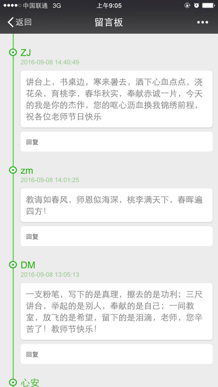 同时,在院团委官方微信平台,也专门设立了“感念师恩表白墙”专题,“张老师,虽然你平时管我们管的很严,可是我们仍然特别感谢您,在这个特别的节日里,衷心祝愿您节日快乐!”在这里,来自各个班级的团员青年们用最真切最质朴的语言表达了对老师的感谢。