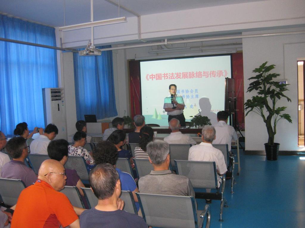 为迎接建党95周年,离退休党总支特邀秦都区书协主席王飞虎做客文化大讲堂,举办题为“中国书法发展脉络与传承”的精彩讲座。离退休处二层会议厅内,在职、离退休人员以及在校学生等书法爱好者百余人到场聆听,讲座由离退处万可顺主持。