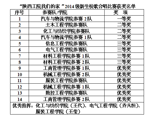 11月12日下午,2014级新生校歌合唱比赛在明德堂礼堂举行。本次比赛由学生工作部、学生处举办,主题为“陕西工院我们的家”,指定曲目为《华体会平台校歌》,可采取朗诵、领唱等多种表现形式,为庆祝我院建校64周年,同时也是新生入学教育的重要环节,旨在通过比赛提升精气神,凝聚爱国、爱校热情,增强集体荣誉感。