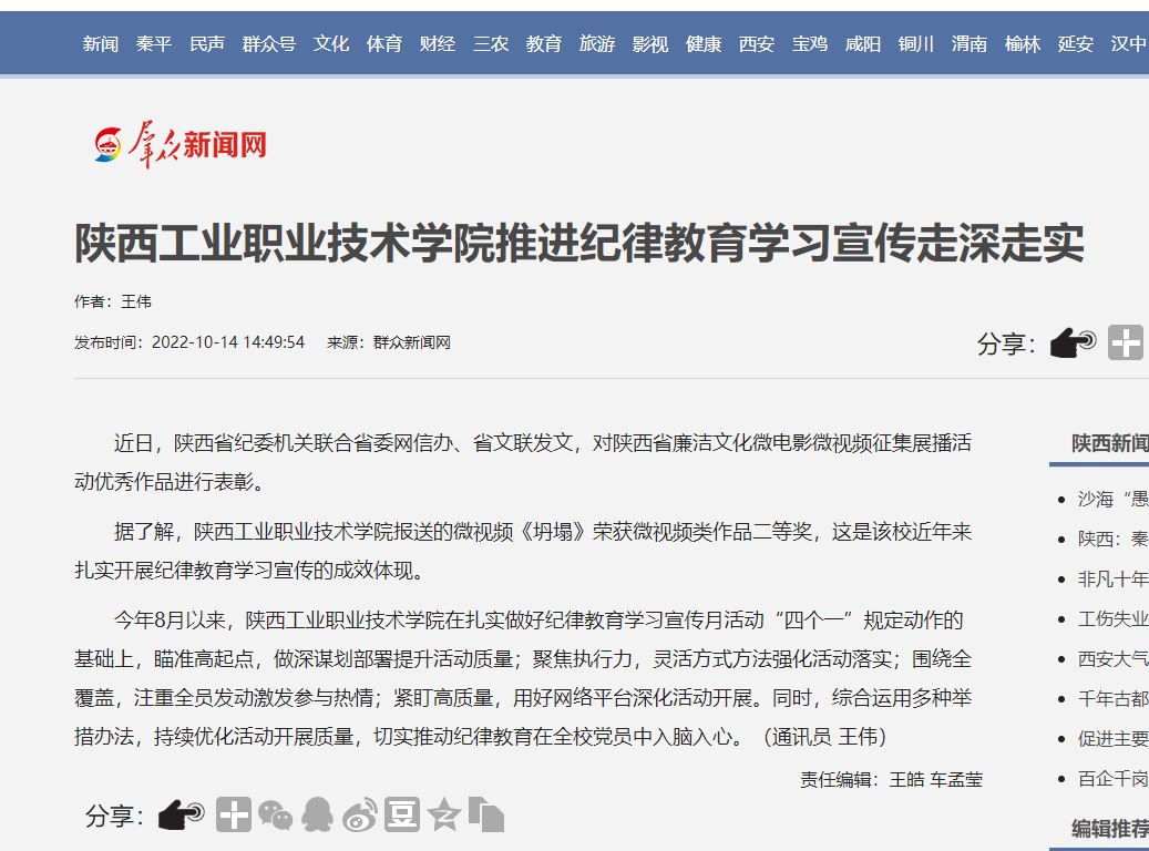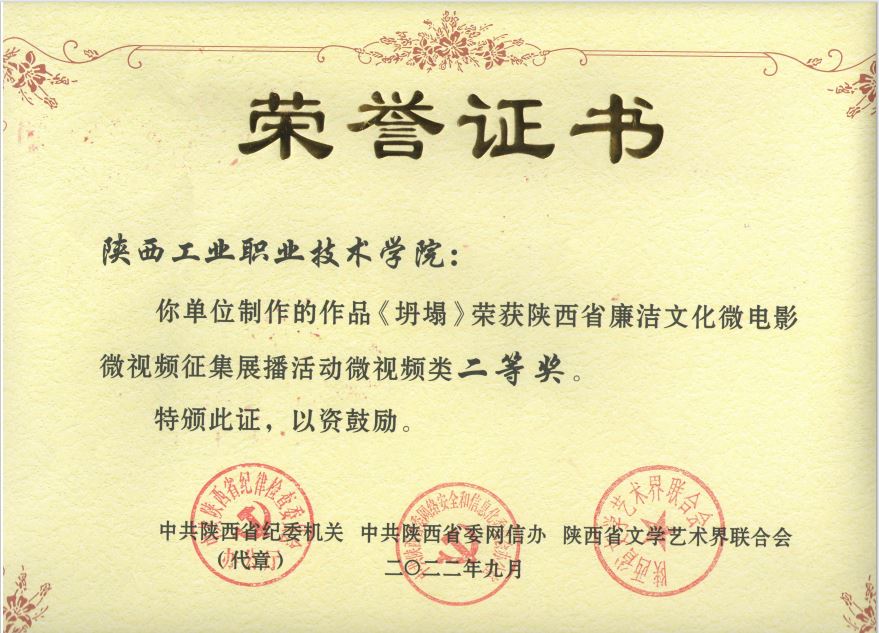 近日,陕西省纪委机关联合省委网信办、省文联发文,对陕西省廉洁文化微电影微视频征集展播活动优秀作品进行表彰,华体会平台报送的微视频《坍塌》荣获微视频类作品二等奖,作为全省高校系统报送的最好获奖等次作品,这是该校近年来扎实开展纪律教育学习宣传月活动的成效体现。