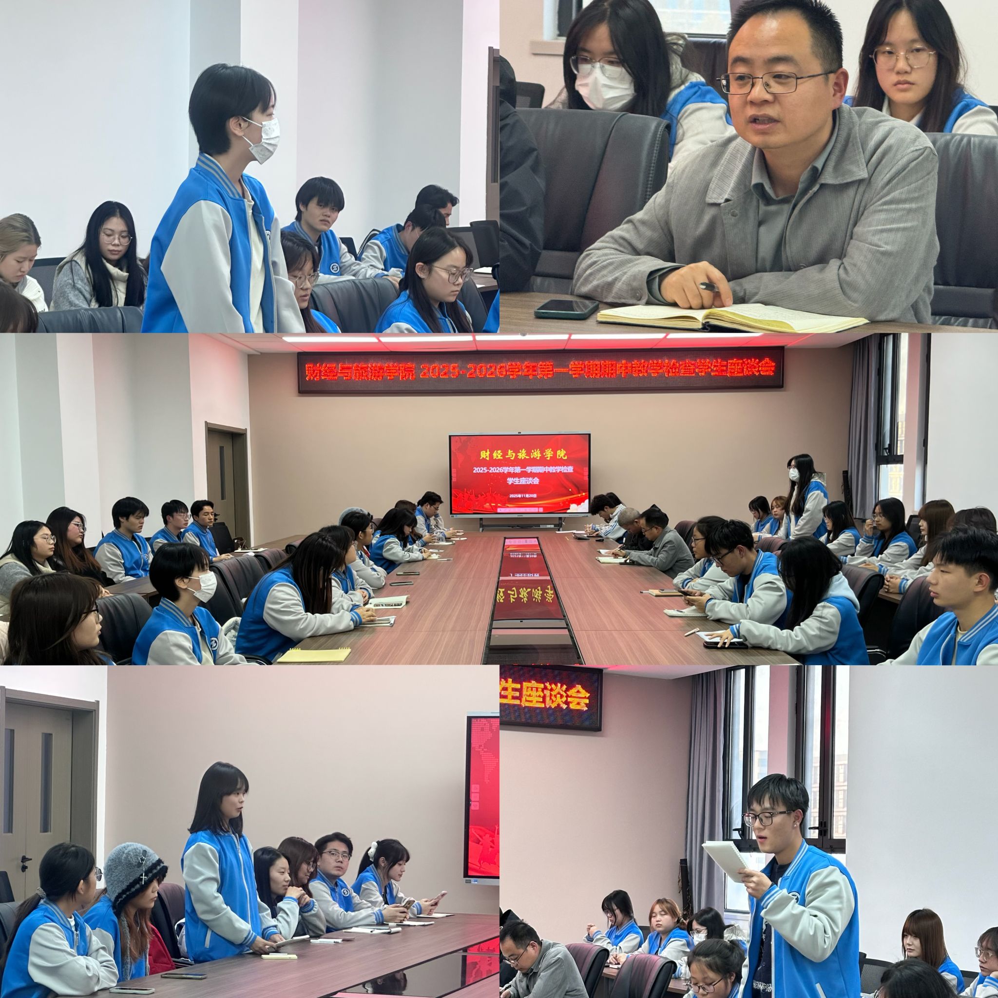 为全面掌握教学运行实况,畅通师生沟通渠道,持续提升教育教学质量,近日,财经与旅游学院组织召开 2025-2026 学年第一学期期中教学检查学生座谈会。财经与旅游学院学工办主任李友治、2025级、2024级年级辅导员及三个年级学生代表共60余人参加了会议,座谈会由学工办主任李友治主持。