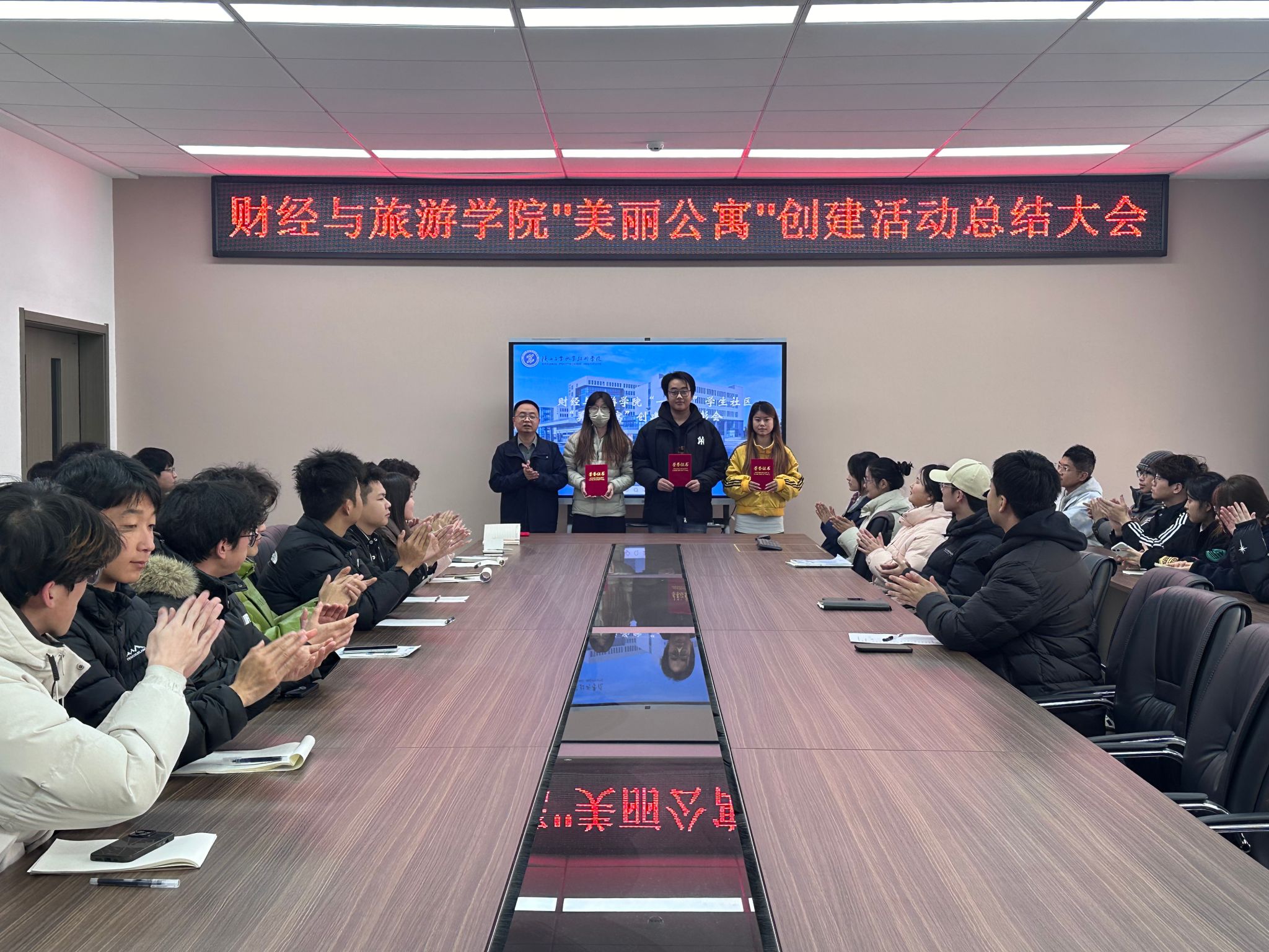 为全面总结“美丽公寓”创建活动成效,巩固文明建设成果,进一步推进学生社区育人环境优化,财经学院于12月4日下午在崇理D504召开“美丽公寓”创建活动总结表彰大会。学工办主任、年级辅导员、学生会全体干部及获奖学生代表参加了会议。