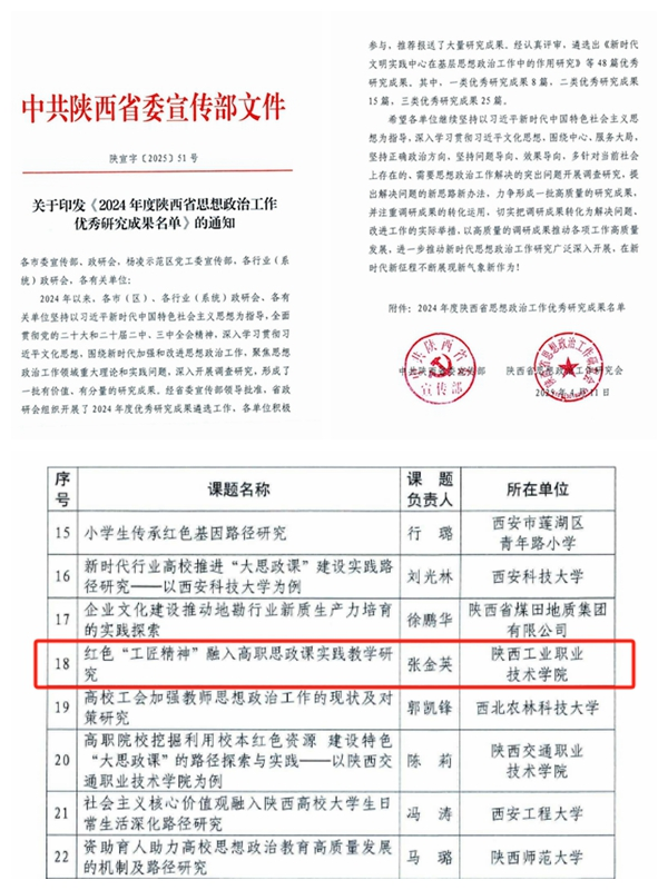 近日,中共陕西省委宣传部、陕西省思想政治工作研究会公布了2024年度陕西省思想政治工作优秀研究成果,我校马克思主义学院教师张金英主持的课题《红色“工匠精神”融入高职思政课实践教学研究》获评三类优秀研究成果。