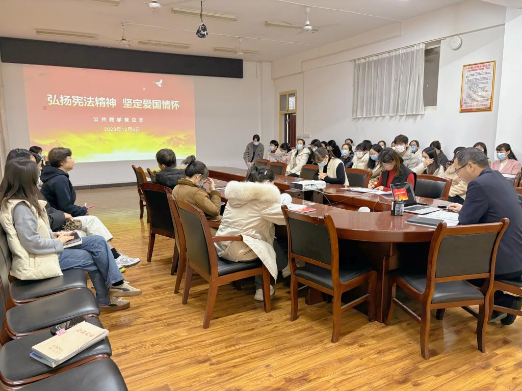 为认真学习宣传贯彻党的二十大精神、习近平法治思想和习近平总书记关于宪法法治教育的重要指示精神,为增强教职工法治观念和爱国情怀,12月6日下午,公共教学部党总支以“宪法宣传周”系列活动和《中华人民共和国爱国主义教育法》为内容开展了“弘扬宪法精神,坚定爱国情怀”主题党日活动,公共教学部党总支书记苏宏志为部门全体教师讲授党课。